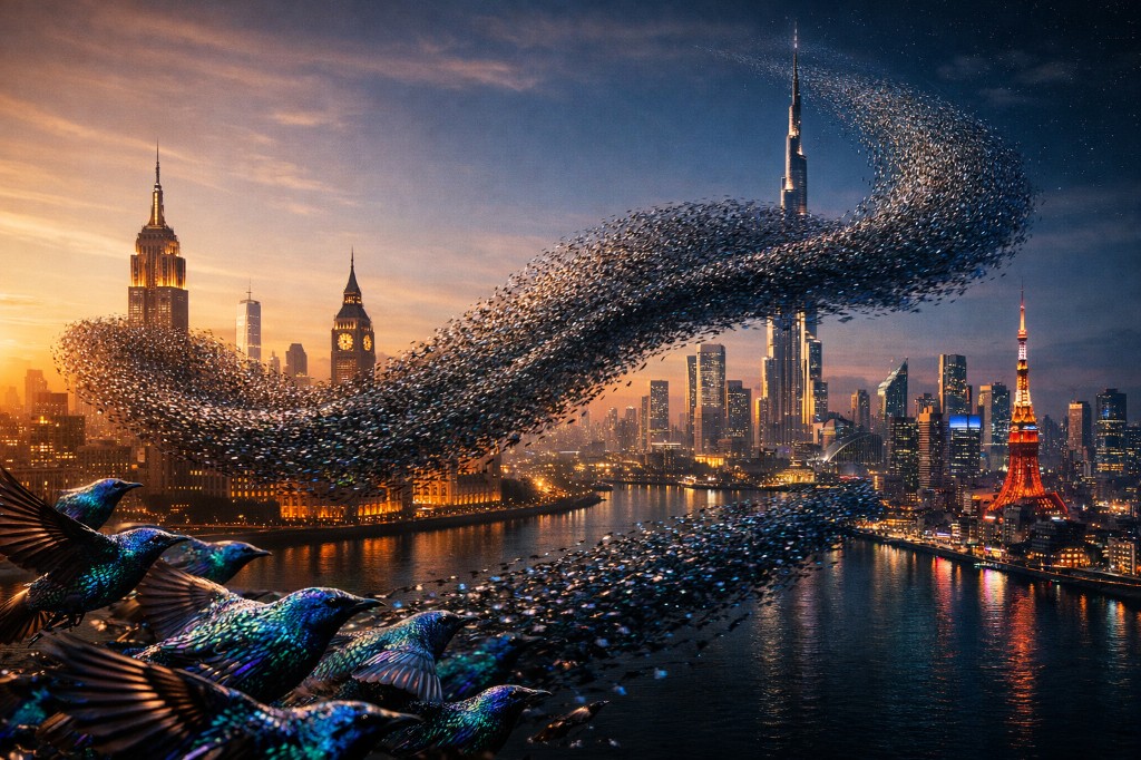 Starlings move as one without a leader. Each bird reads local signals—distance, velocity, direction—then the whole sky becomes a living instrument.